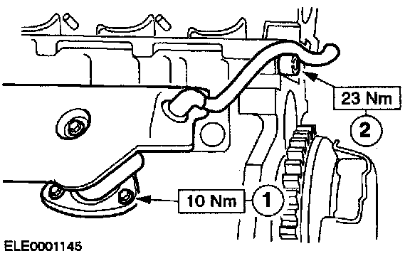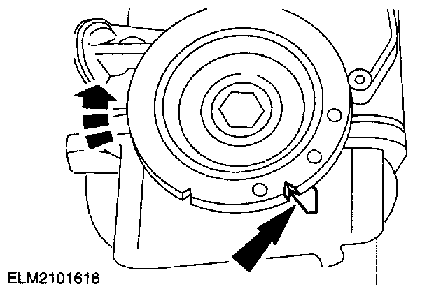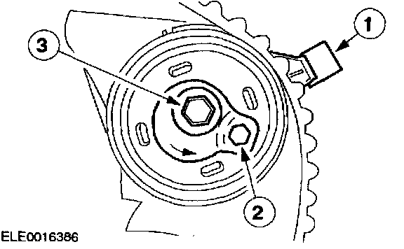 1. Rotate the tensioner locating tab counterclockwise and insert the locating tab into the slot in the rear timing cover.