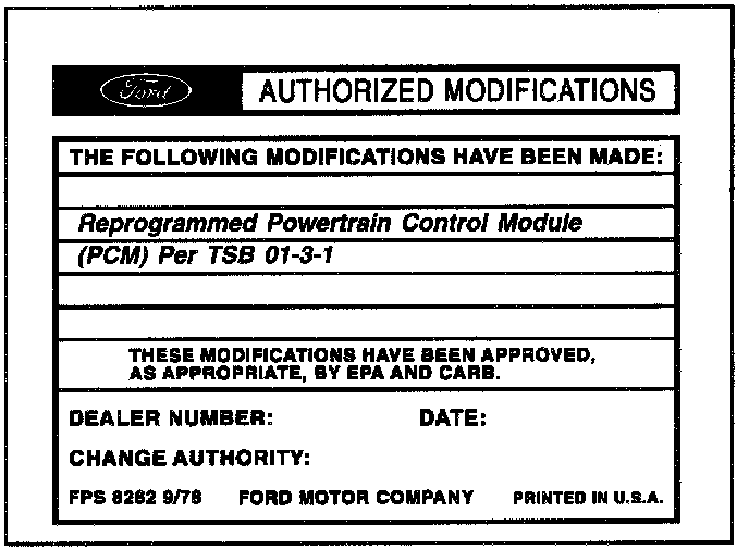 Obtain an Authorized Modifications Decal (FPS 8262 - obtainable through DOES II, 25/pkg) and list the date, dealer number, and summary of modifications performed. Select a prominent place adjacent to the Vehicle Emission Control Information Decal suitable for installing the Authorized Modifications Decal. Clean the area, install the decal, and cover it with a clear plastic decal shield.