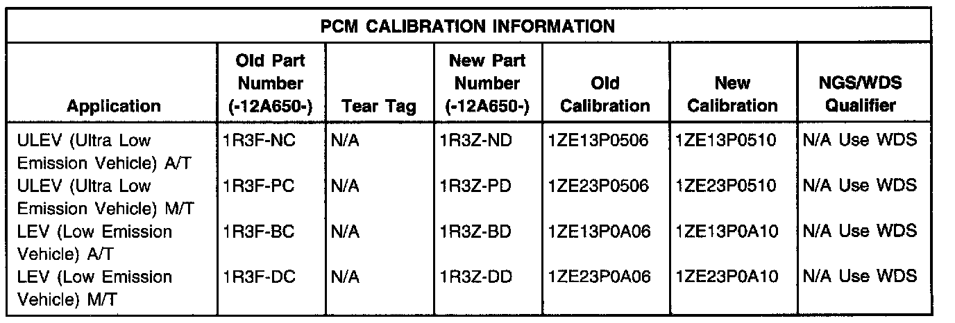 Repair any DTCs as necessary. If normal diagnostics fail to identify a concern, reprogram the PCM using the Worldwide Diagnostic System (WDS) as necessary. Refer to the PCM Calibration Information Chart shown.