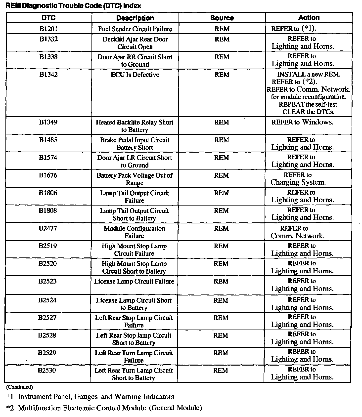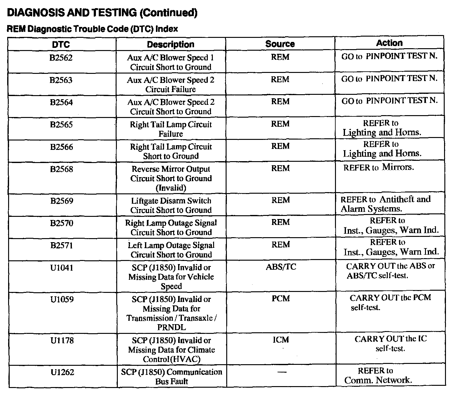 Rear Electronic Module (REM) Diagnostic Trouble Code Index