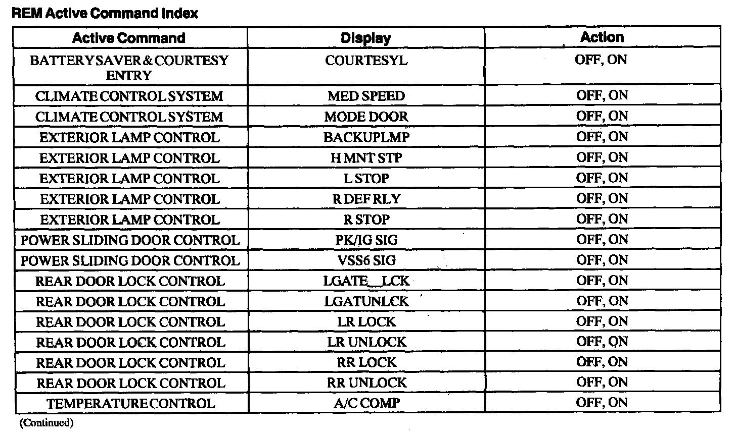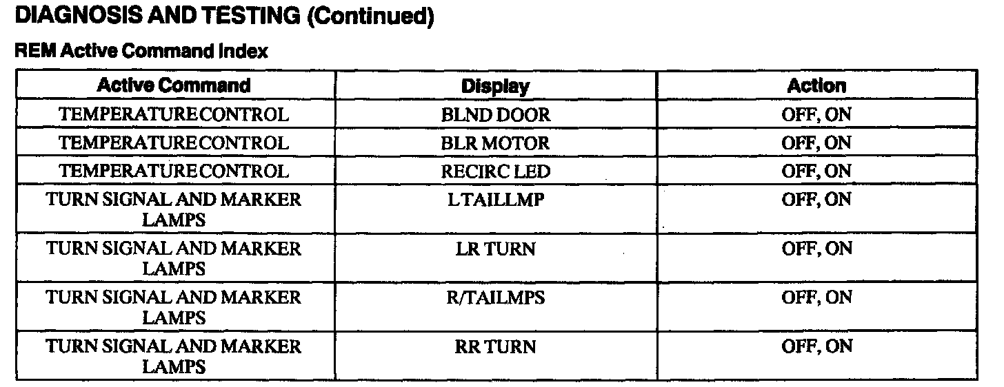 Rear Electronic Module (REM) Active Command Index