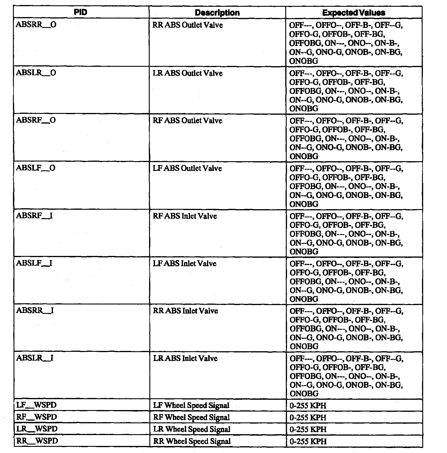 Anti-Lock Brake (ABS) Control Module Parameter Identification (PID) Index