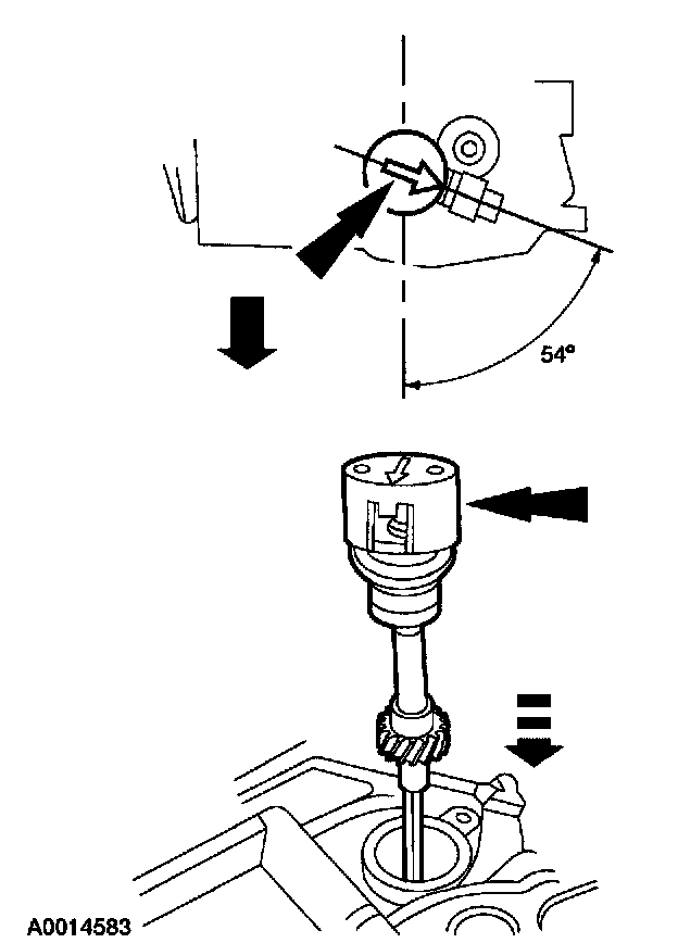 2. Install the camshaft synchronizer housing assembly so the arrow on the synchronizer alignment tool is 54 degrees from the centerline of the engine.