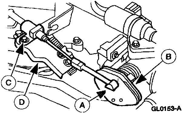 2. Disconnect the (A) speed control actuator cable from the (B) throttle control lever and remove the (C) bolt from the (D) bracket.
