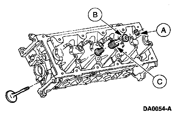 5. Remove the (A) valve spring retainer keys, the (B) valve spring retainers, and the (C) valve spring.
