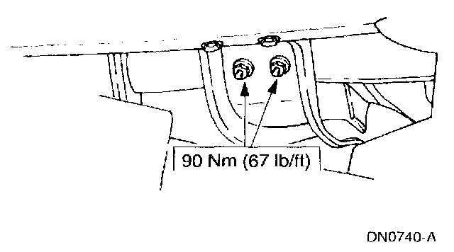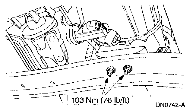 7. Tighten the transmission support crossmember nuts and bolts (RH side) to specification.