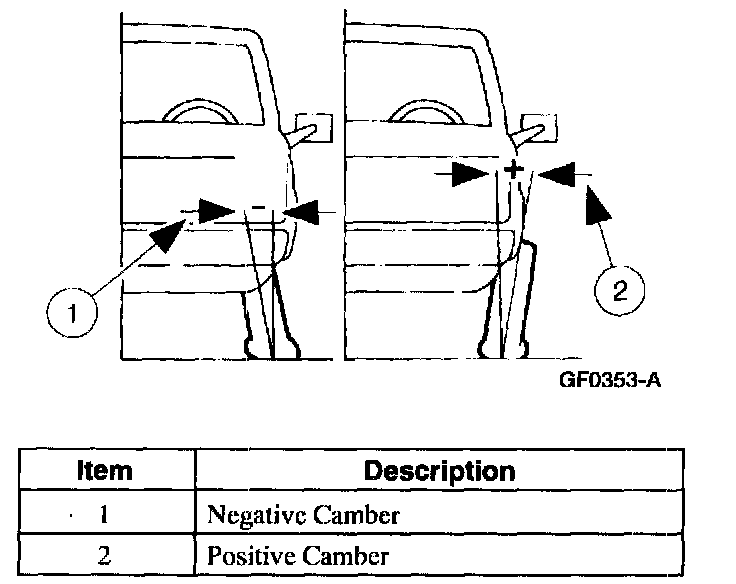 Camber is the inward or outward tilting of the wheels at the top. When the wheels tilt out at the top the camber is positive (+). When the wheels tilt in at the top the camber is negative (-). The amount of camber is measured in degrees from vertical.