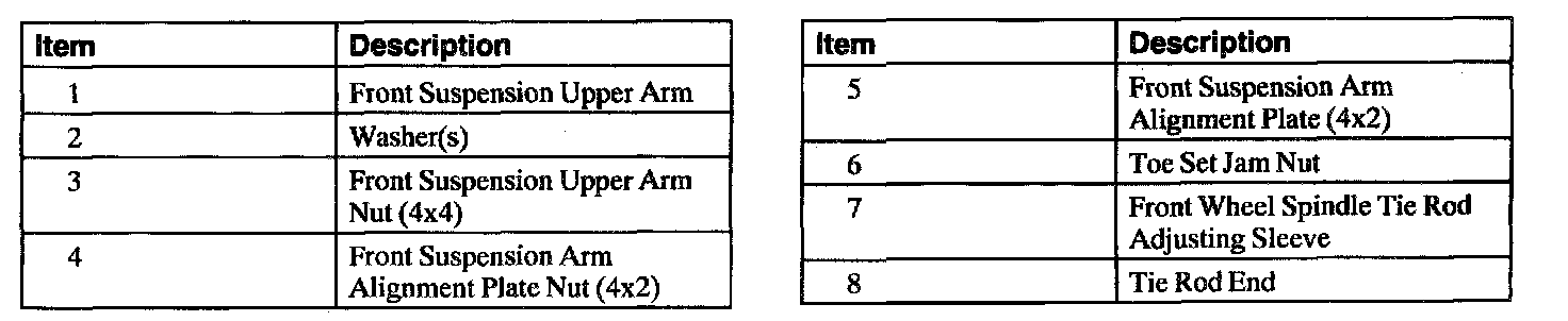 Caster and camber are adjusted by means of eccentric cams on the upper control arm mounting bolts. Toe is adjusted by the use of the front wheel spindle tie rod adjusting sleeve.