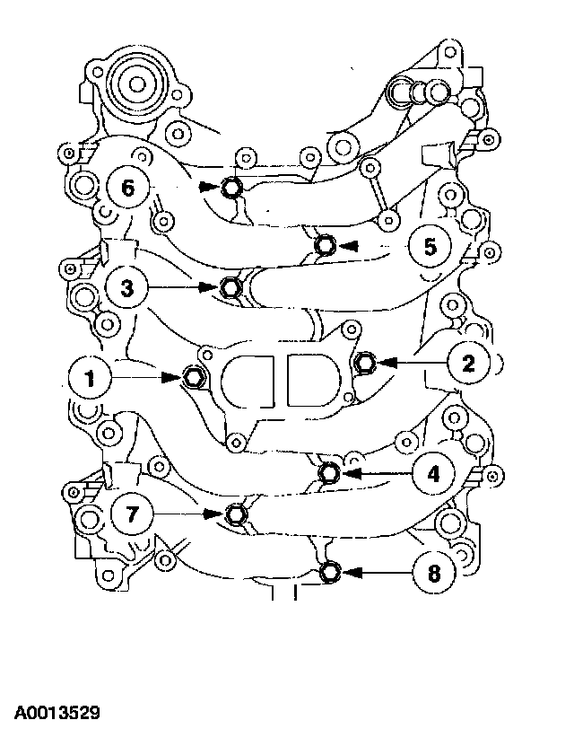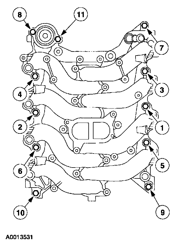 NOTE: The thermostat housing bolts are tightened in sequence with the intake manifold bolts. Do not tighten the thermostat housing bolts during thermostat installation.