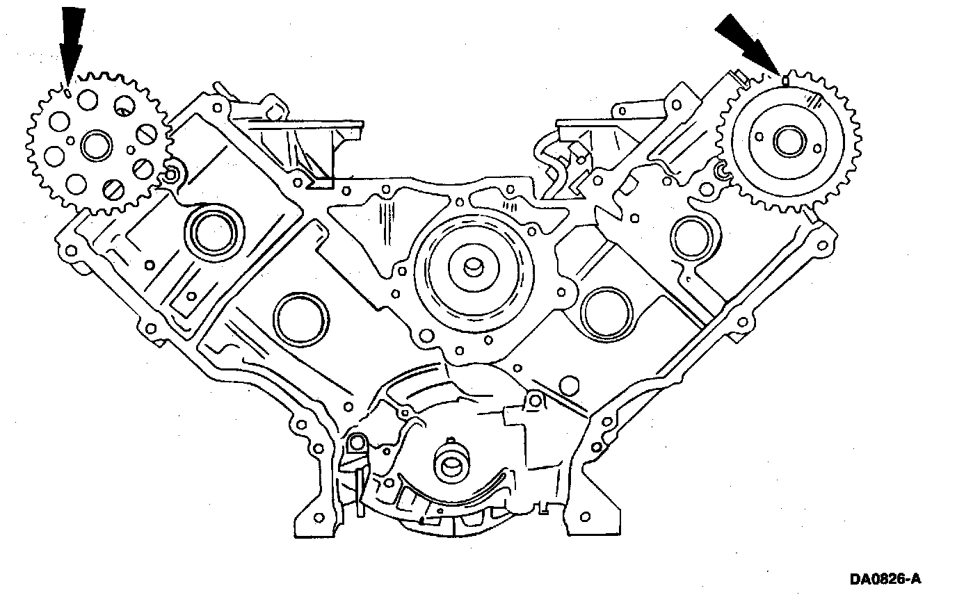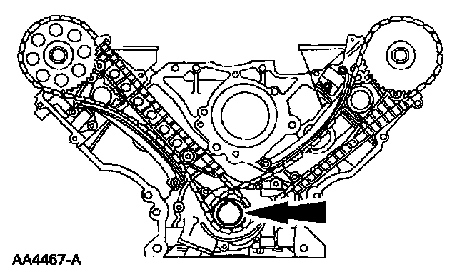 CAUTION: Unless otherwise instructed, at no time when the timing chains are removed and the cylinder heads are installed is the crankshaft or camshaft to be rotated. Severe piston and valve damage will occur.