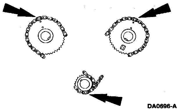 - Position the RH timing chain on the camshaft sprocket. Make sure the two copper-colored links align with the camshaft sprocket timing mark.