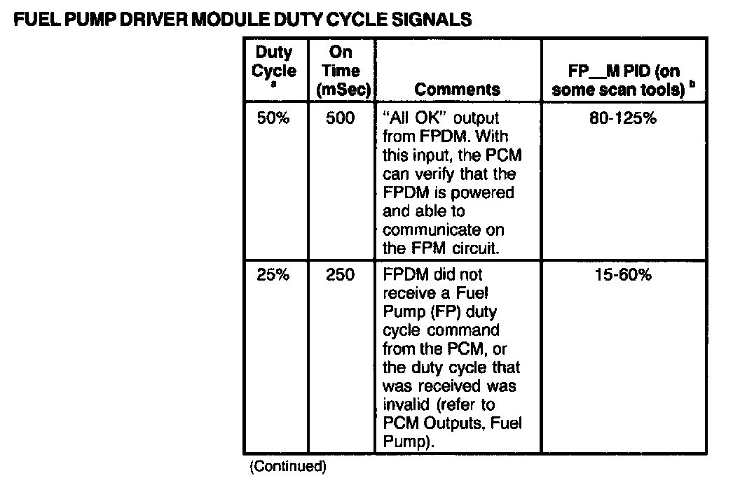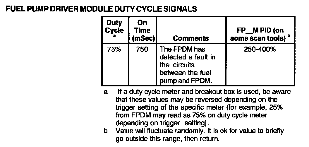 The Fuel Pump Driver Module (FPDM) communicates diagnostic information to the Powertrain Control Module (PCM) through the Fuel Pump Monitor (FPM) circuit. This information is sent by the FPDM as a duty cycle signal. The three duty cycle signals that may be sent are listed in the table.