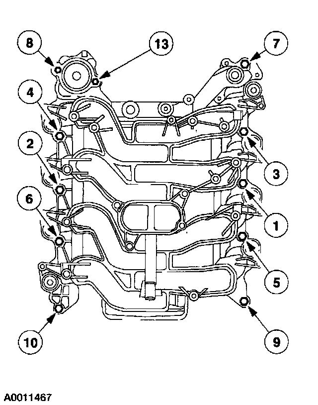 Intake ManifoldNOTE: The thermostat at housing bolts are tightened in sequence with the intake manifold bolts. Do not tighten the thermostat housing bolts during thermostat installation.