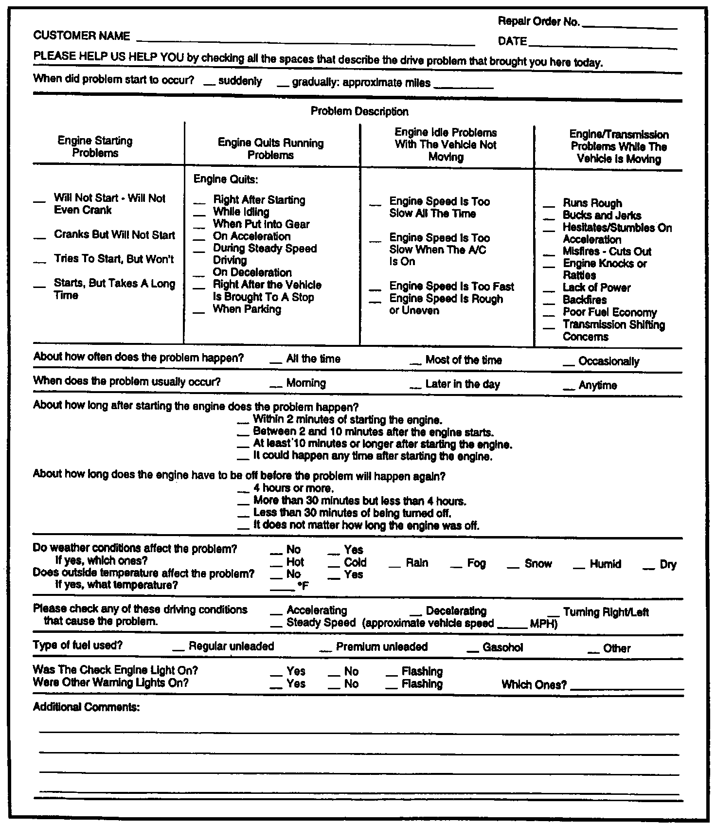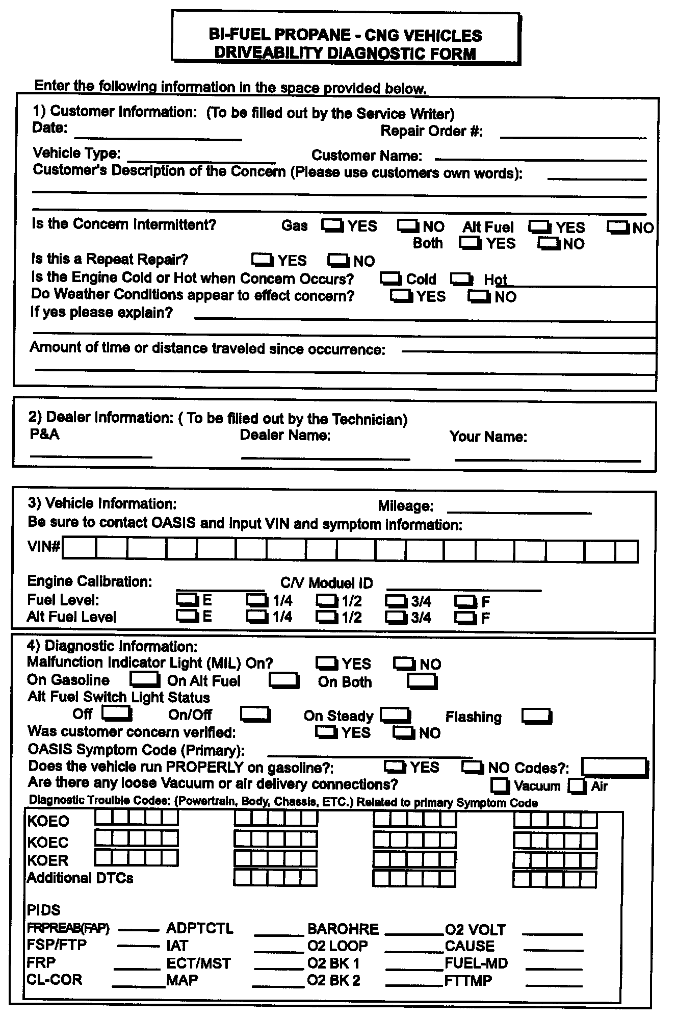 Utilize the Customer Information Worksheet and the Bi-Fuel Driveability Diagnostic Form to record customer and test data during diagnosis, or before contacting Hotline for technical assistance.