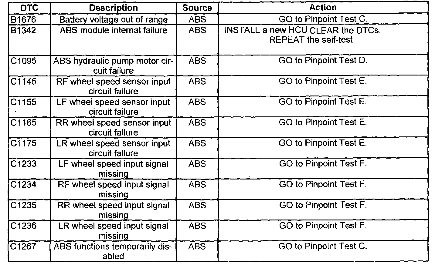ABS Control Module Diagnostic Trouble Code (DTC) Index