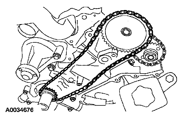^ Position the timing chain over the LH intake camshaft sprocket. Position the crankshaft gear in the timing chain. Position the timing chain and crankshaft gear over the crankshaft as an assembly.