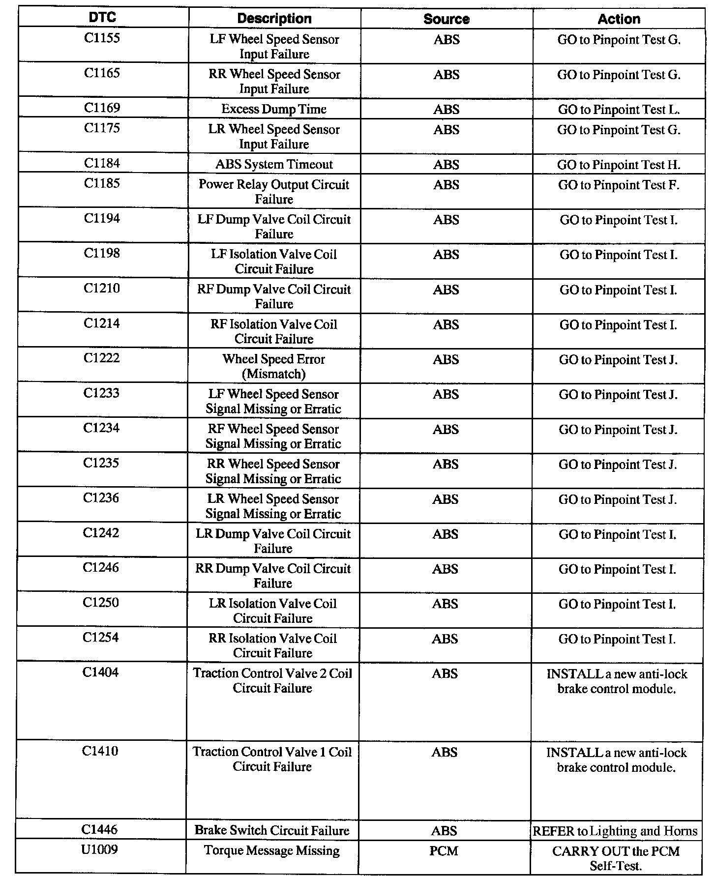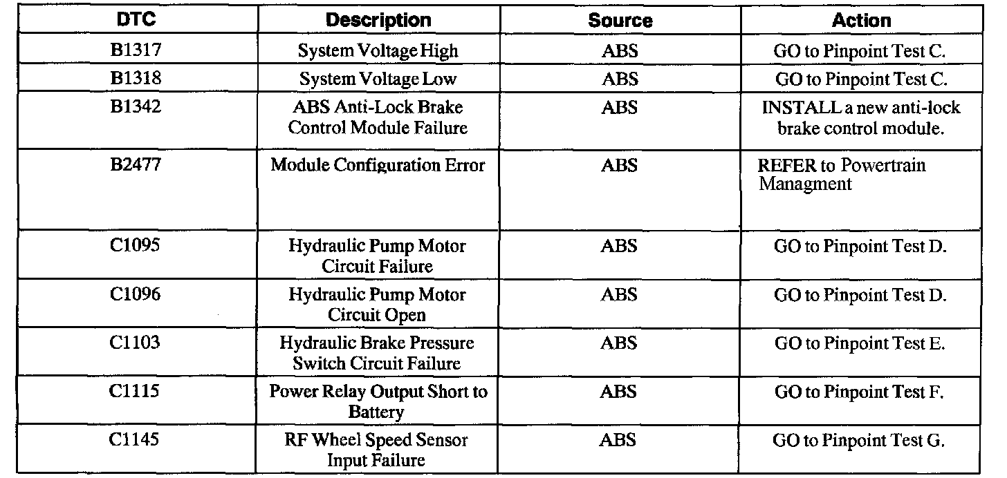 ABS Control Module Diagnostic Trouble Code (DTC) Index
