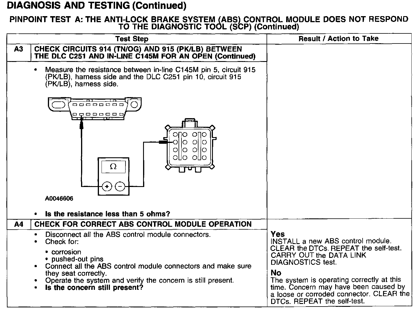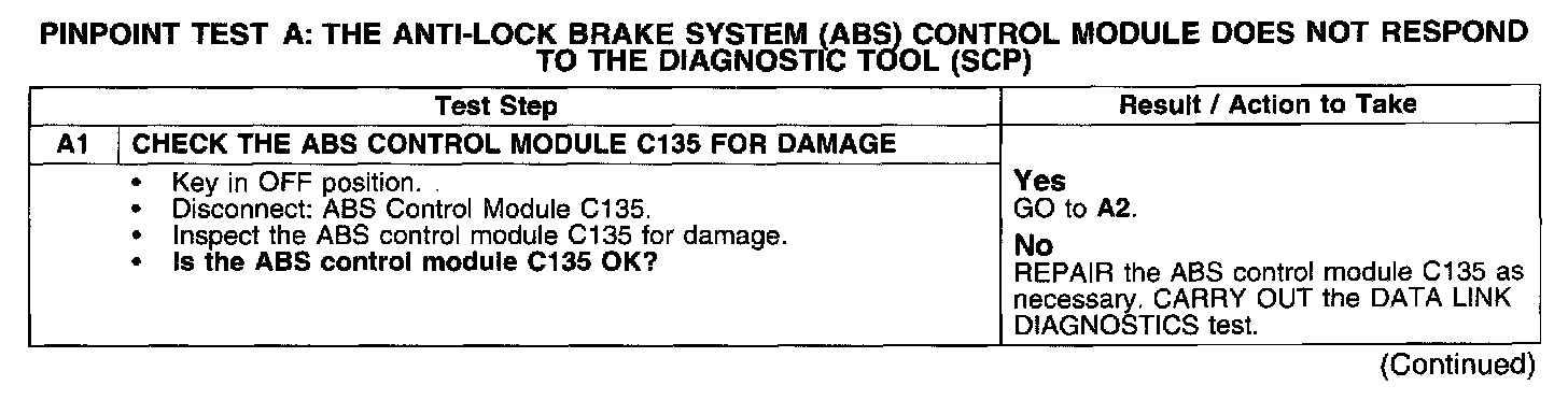 PINPOINT TEST A: THE ANTI-LOCK BRAKE SYSTEM (ABS) CONTROL MODULE DOES NOT RESPOND TO THE DIAGNOSTIC TOOL (SCP)