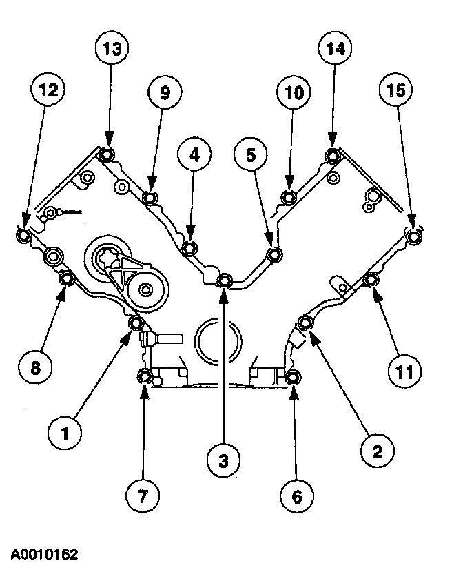 Tighten the front cover bolts and stud bolts in sequence in two stages.