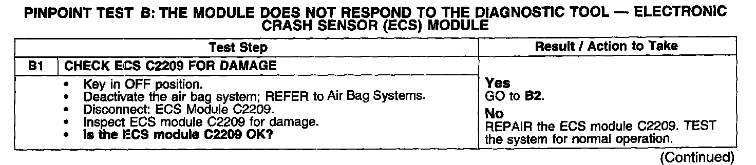 PINPOINT TEST B: THE MODULE DOES NOT RESPOND TO THE DIAGNOSTIC TOOL - ELECTRONIC CRASH SENSOR (ECS) MODULE