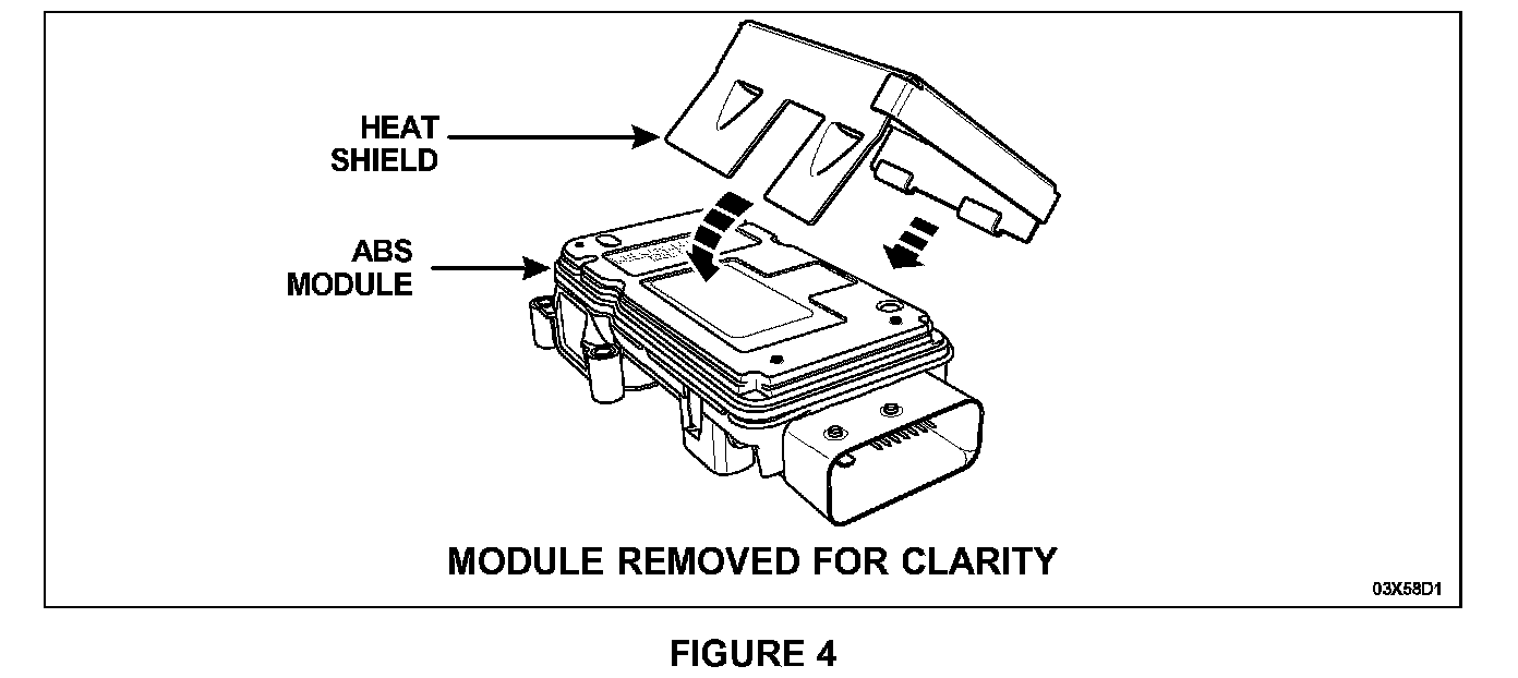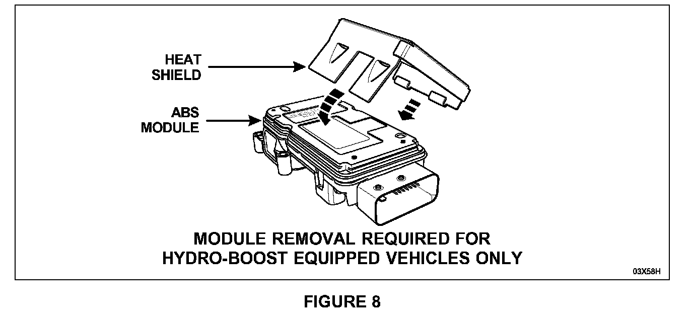 To install the heat shield on vehicles with Hydro-boost, the ABS module must be removed from the HCU due to lack of clearance between the module and the brake master cylinder.