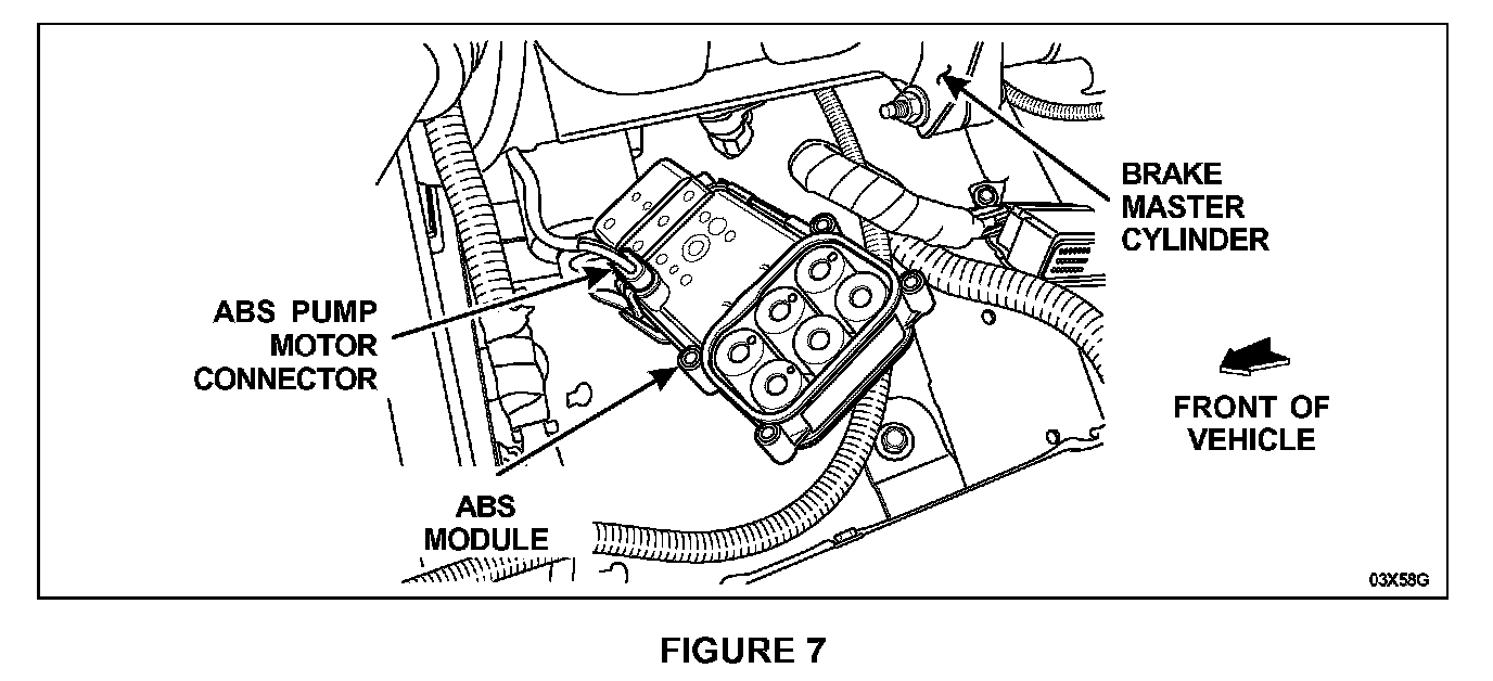 5. Lift the module slightly and position it so you can access and disconnect the ABS pump motor connector. Then disconnect the pump motor and remove the module from the vehicle. See Figure 7.