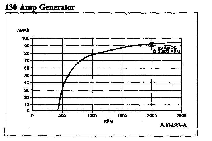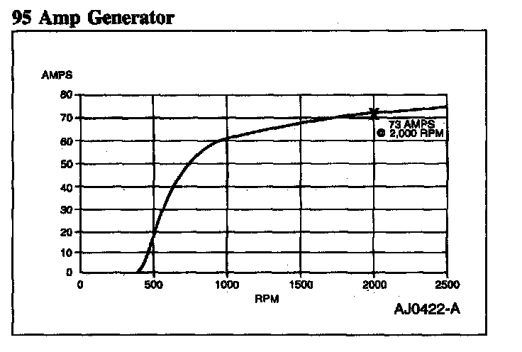 4. With the engine running at 2,000 rpm, adjust the tester load bank to determine the output of the generator. Generator output should be greater than the applicable graphs shown. If not, refer to the battery will not stay charged or low battery or generator voltage in the symptom chart.