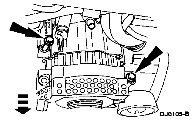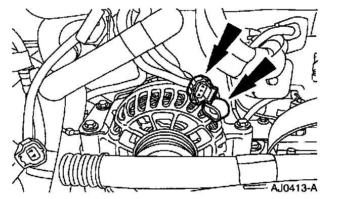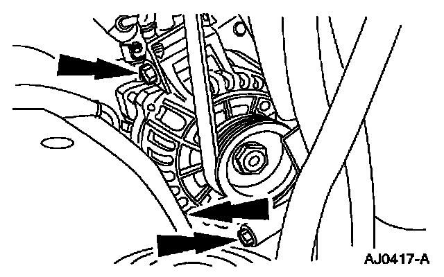 8. Remove the three bolts from the lower generator and partially remove generator by pulling generator out slightly and then down. Once generator is partially removed, disconnect the positive battery cable from the back of the generator and remove the generator.