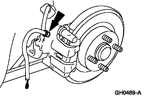 5. If equipped with rear disc brakes, attach a rubber drain hose to the RH rear disc brake caliper bleeder screw and submerge the free end of the hose in a container partially filled with clean brake fluid.