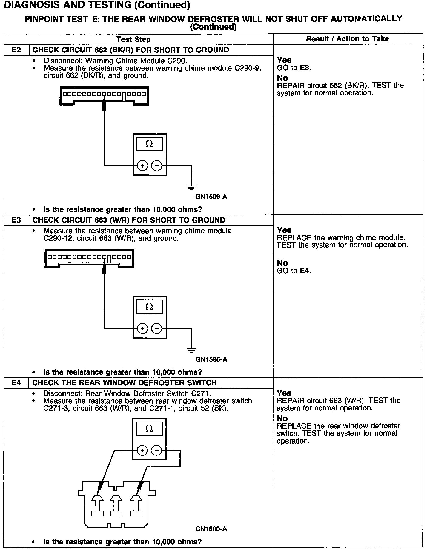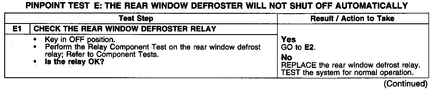 PINPOINT TEST E: THE REAR WINDOW DEFROSTER WILL NOT SHUT OFF AUTOMATICALLY