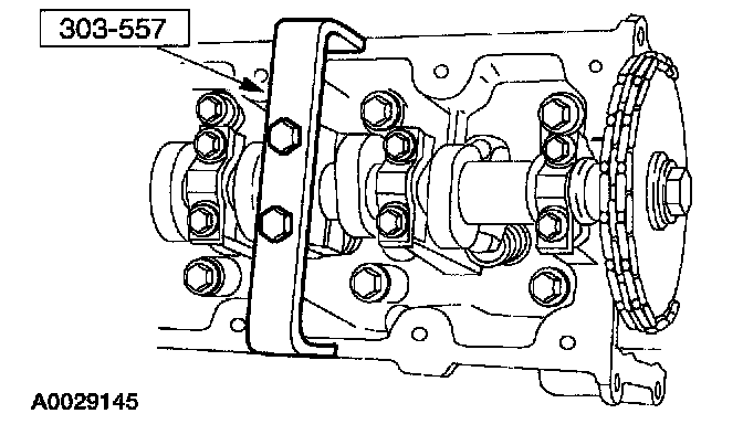 6. CAUTION: Unless otherwise instructed, at no time when the timing chains are removed and the cylinders heads are installed is the crankshaft or camshaft to be rotated. Severe piston and valve damage will occur.