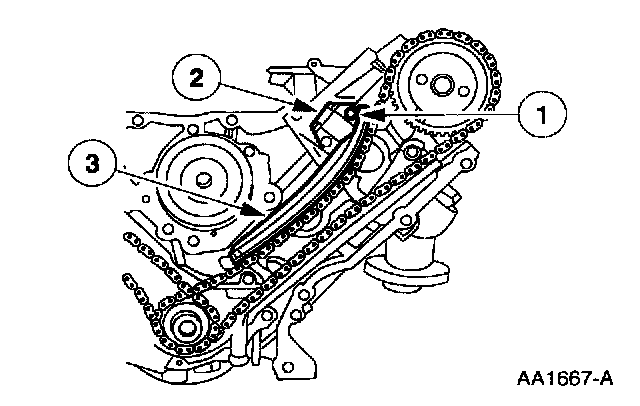 3. CAUTION: Unless otherwise instructed, at no time when the timing chains are removed and the cylinder heads are installed is the crankshaft or camshaft to be rotated. Severe piston and valve damage will occur.