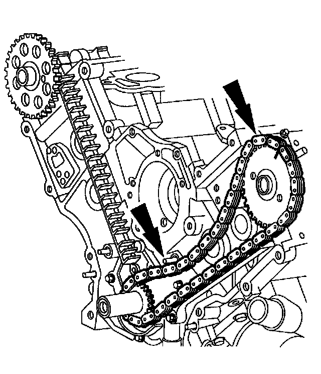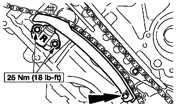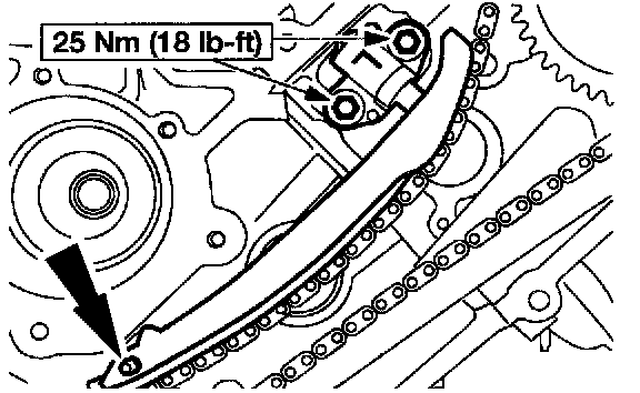 15. NOTE: The lower half of the timing chain must be positioned above the tensioner arm dowel.