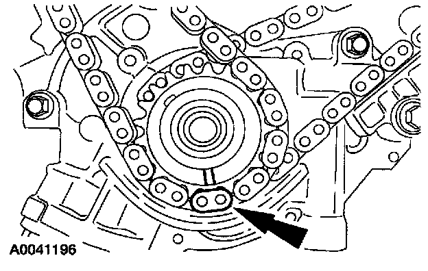 11. Position the lower end of the LH (inner) timing chain on the crankshaft sprocket, aligning the timing mark on the outer flange of the crankshaft sprocket with the single copper (marked) link on the chain.