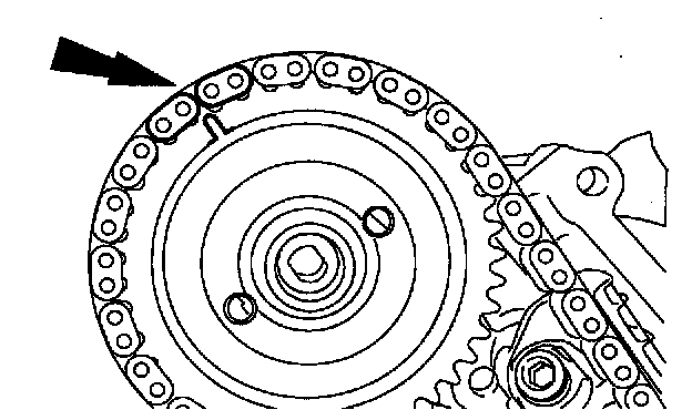 Position the timing chain on the camshaft sprocket with the camshaft sprocket timing mark positioned between the two copper (marked) chain links.