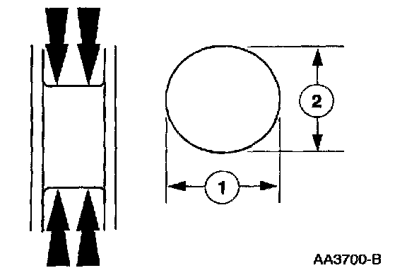 1. Measure the crankshaft connecting rod journal diameters in two directions perpendicular to one another at each end of the connecting rod journal. The difference in the measurements from one end to the other is the taper. Verify measurement is within the wear limit.