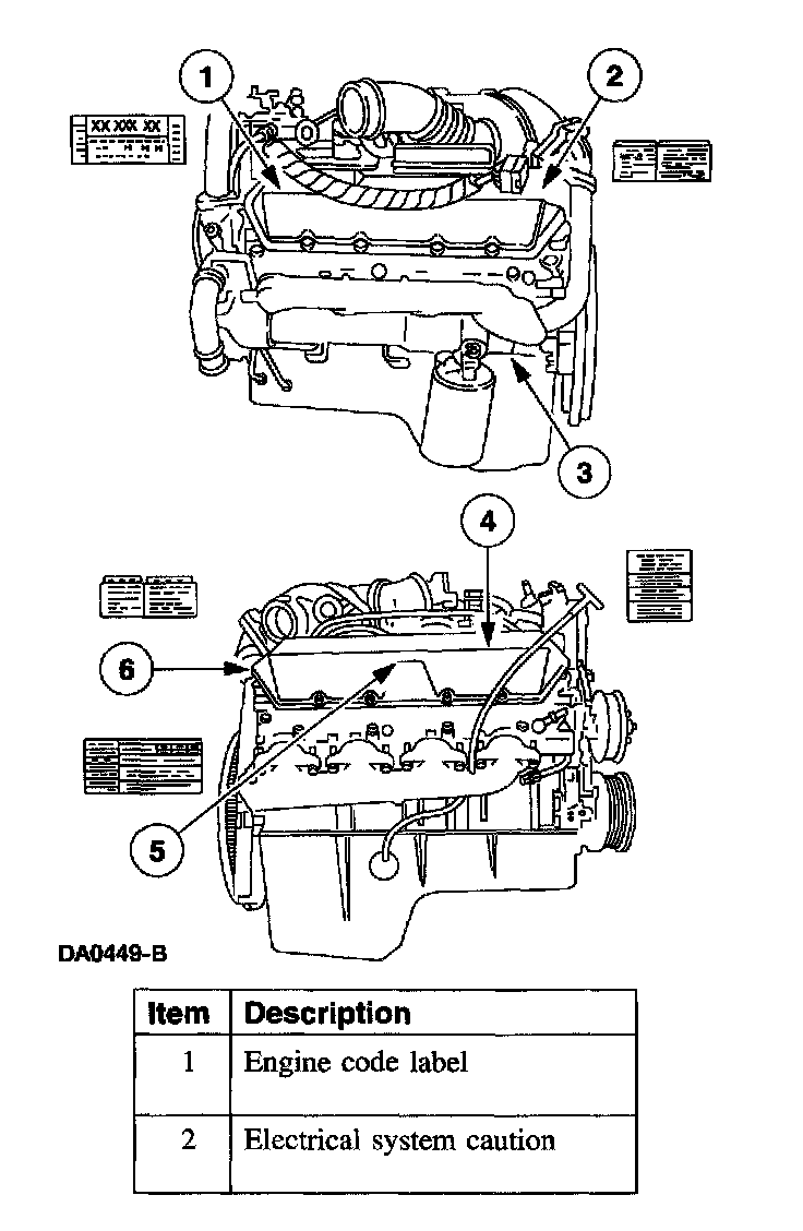 Engine IdentificationFor specific and exact engine identification, an engine calibration code label is affixed to the B-pillar. Refer to the illustration for examples of engine identification labeling.