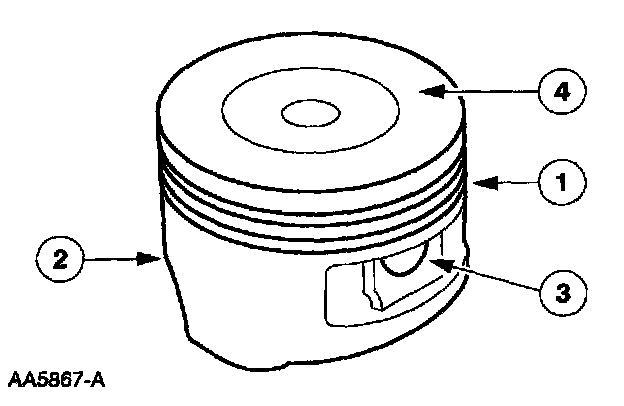 1. Clean and inspect the (1) ring lands, (2) skirts, (3) pin bosses, and the (4) tops of the pistons. If wear marks, scores or glazing is found on the piston skirt, check for a bent or twisted connecting rod.