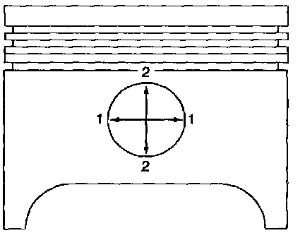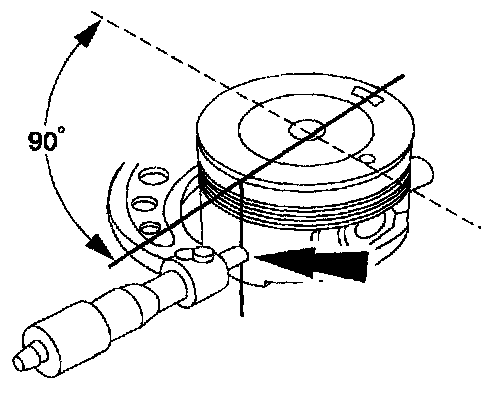 1. Measure the piston diameter 90 degrees from the piston pin at the point indicated.