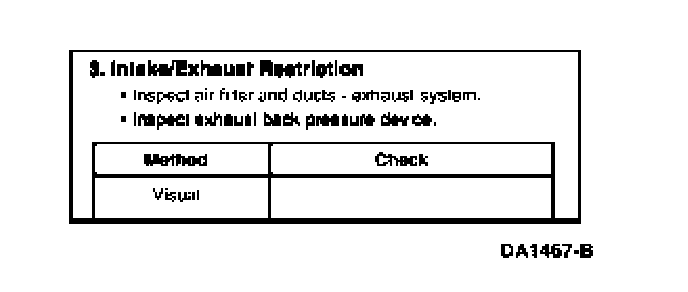 This is a visual inspection to determine if an air intake or exhaust restriction is contributing to a no start or hard start condition. If the engine does start with a high air intake or exhaust restriction a considerable amount of black/blue smoke is produced.