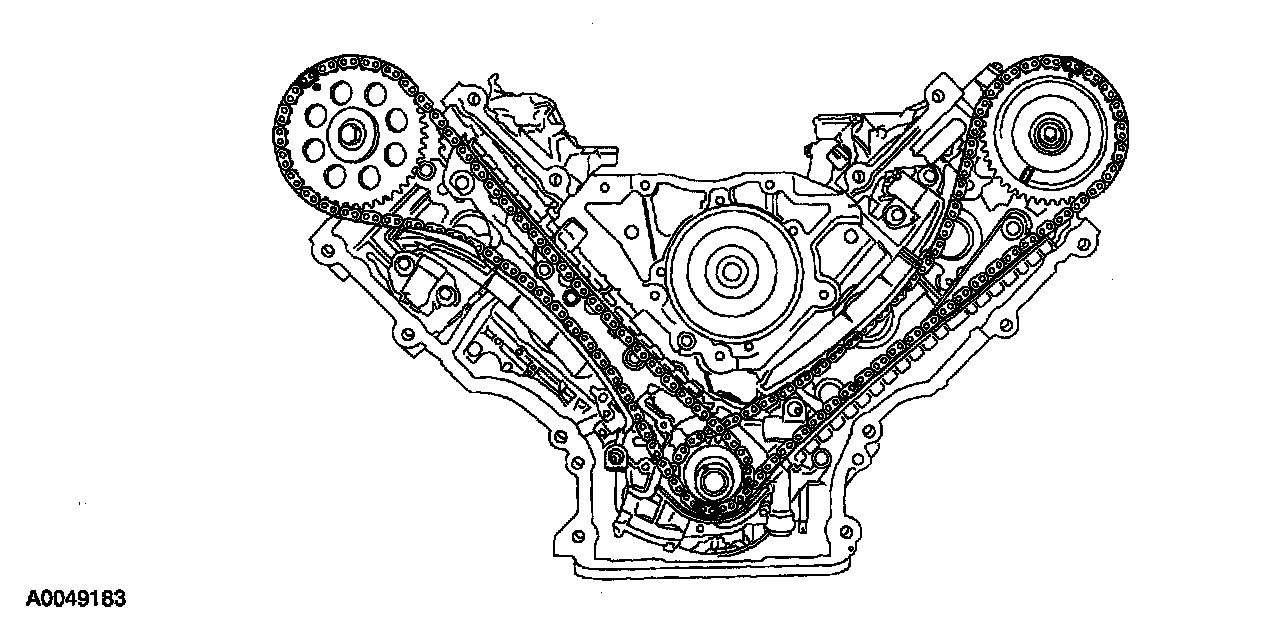 Timing mark on the RH camshaft sprocket is approximately at the 11 o'clock position and the timing mark on the LH camshaft sprocket is approximately at the 12 o'clock position.