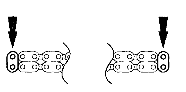 RH (outer) timing chain on the crankshaft sprocket, aligning the copper (marked) link with the timing mark on the sprocket.