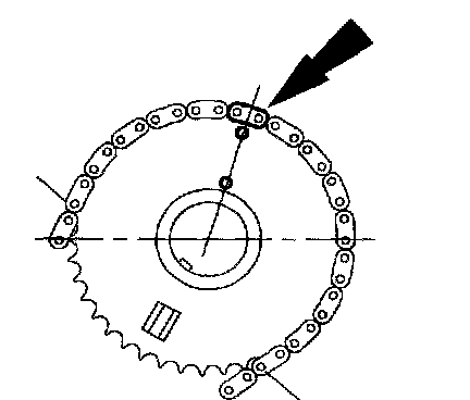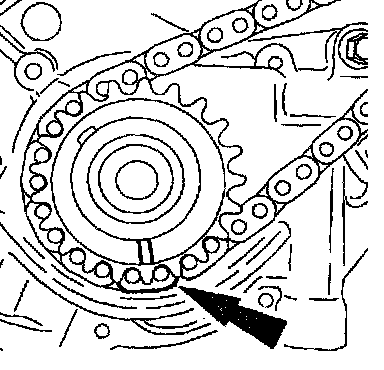 LH (inner) timing chain on the crankshaft sprocket, aligning the copper (marked) link with the timing mark on the sprocket.