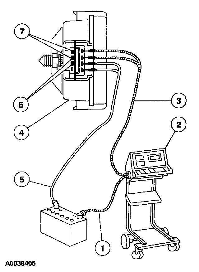 Test the on mode by connecting a separate set of test leads from battery ground (-) post to windshield wiper motor (4) component side pins 6 and 7 (6). When these pins are grounded, the rear window wiper motor operation should now be in on mode.