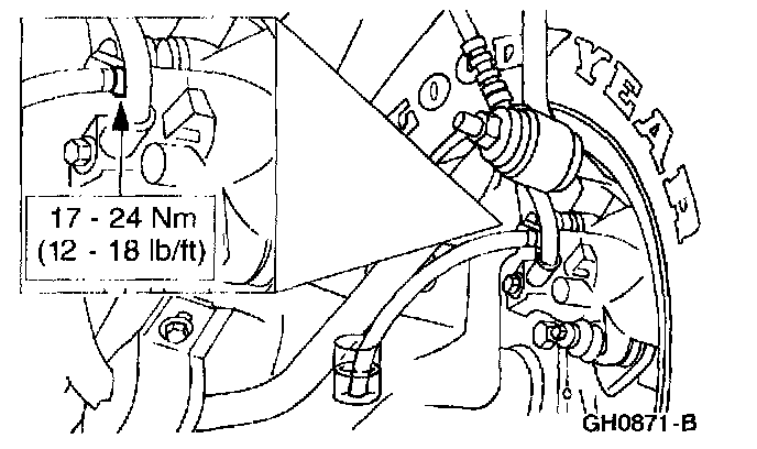 2. Loosen the rear most brake tube fittings until a stream of brake fluid comes out. While the assistant maintains pressure on the brake pedal tighten the brake tube fitting