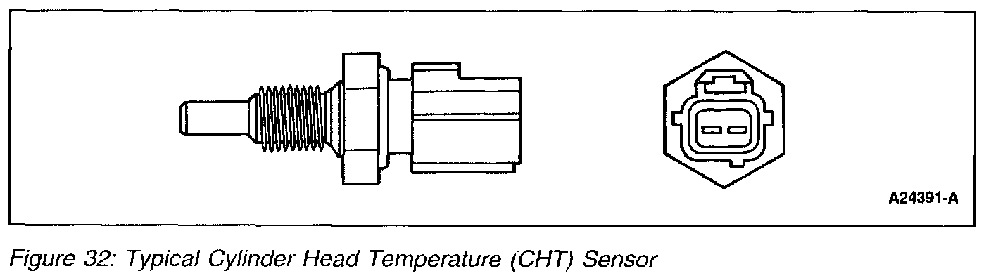 The cylinder head temperature (CHT) sensor (Figure 32) is a thermistor device in which resistance changes with temperature. The electrical resistance of a thermistor decreases as temperature increases, and increases as temperature decreases. The varying resistance affects the voltage drop across the sensor terminals and provides electrical signals to the PCM corresponding to temperature.