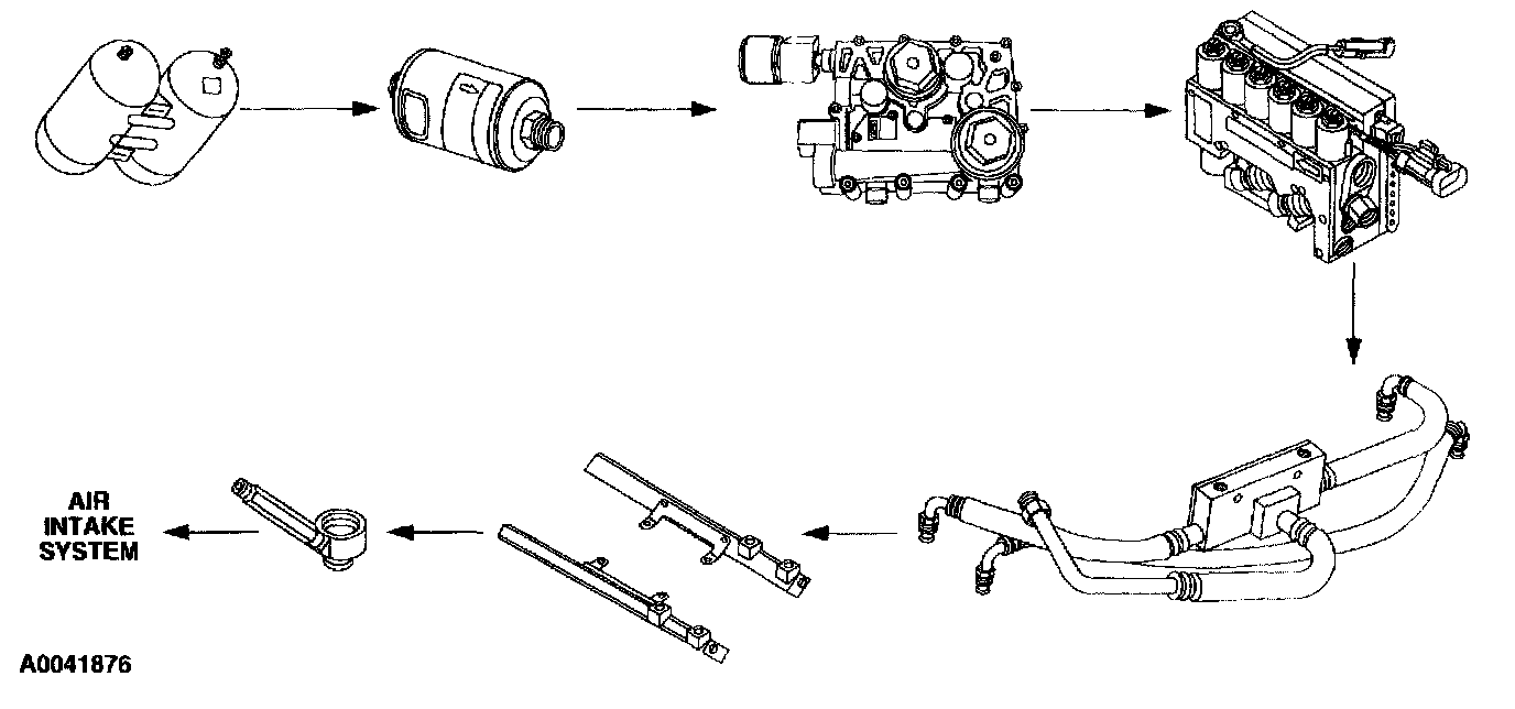 Liquid propane from the liquefied petroleum gas (LPG) fuel tank flows through the manual shutoff valve through the fuel filter to the lock-oft solenoid, located either before, or in the vaporizer. When the lock-oft solenoid is open, liquid propane flows into the vaporizer heat exchanger. Heat from the engine coolant is used to convert the liquid fuel to gas. When engine coolant is below 0°C (32°F), a cold start heater is used to provide heat to the heat exchanger of the vaporizer. The vaporizer provides gaseous propane at a consistent operating pressure to the compuvalve. The compuvalve meters fuel according to demand and calculates spark advance for maximum power and driveability. A combination of sensors and inputs from the Powertrain Control Module (PCM) are used to monitor the engine and the environment to provide closed loop control of fuel. The compuvalve directs fuel through the low pressure hose to a factory set adjustable tuning tee, through the fuel rail assemblies and is introduced into the intake system through fuel injector sleeve assemblies.