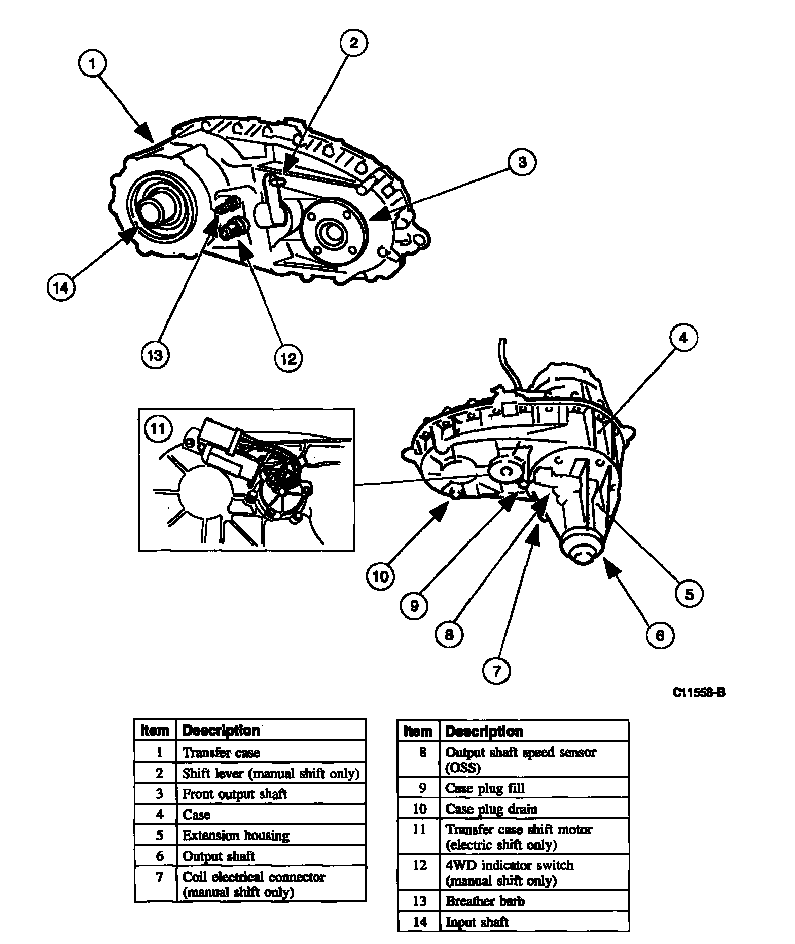 Transfer CaseThe Borg-Warner 44-06 manual shift and electric shift transfer cases are a three-piece aluminum design. The unit transfers engine power from the transmission to the front and rear axles. Under normal driving conditions the unit is in Two-Wheel Drive High (2H) but when desired the operator may shift into Four-Wheel Drive High (4H) or Four-Wheel Drive Low (4L). The operator may shift from 2H to 4H or from 4H to 2H at any speed up to 88 km/h (55 mph). The vehicle must be stopped to shift into 4L. The transfer case is shifted either manually or electronically. The unit is lubricated by a positive displacement fluid pump that channels fluid flow through drilled holes in the rear output shaft.
