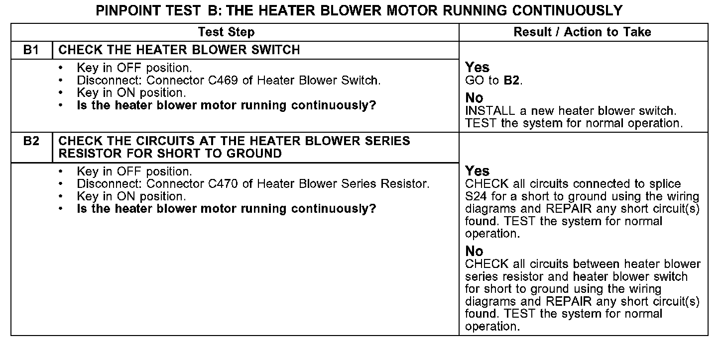 PINPOINT TEST B: THE HEATER BLOWER MOTOR RUNNING CONTINUOUSLY