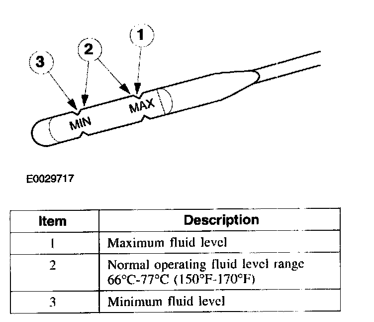CAUTION: The vehicle should not be driven if the fluid level is below the bottom line on the fluid level indicator and the ambient temperature is above 10°C (50°F).